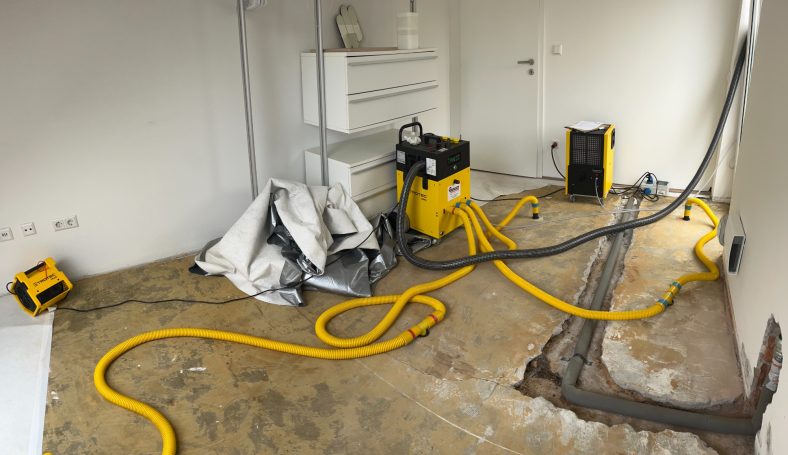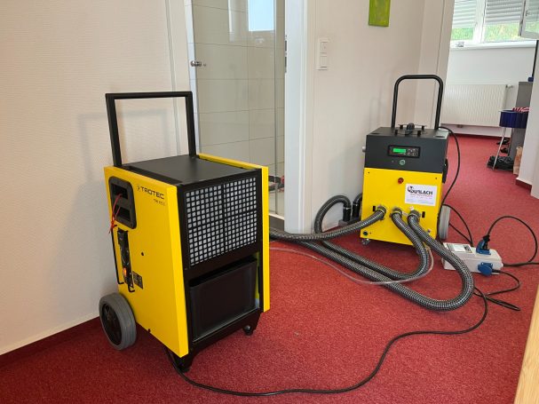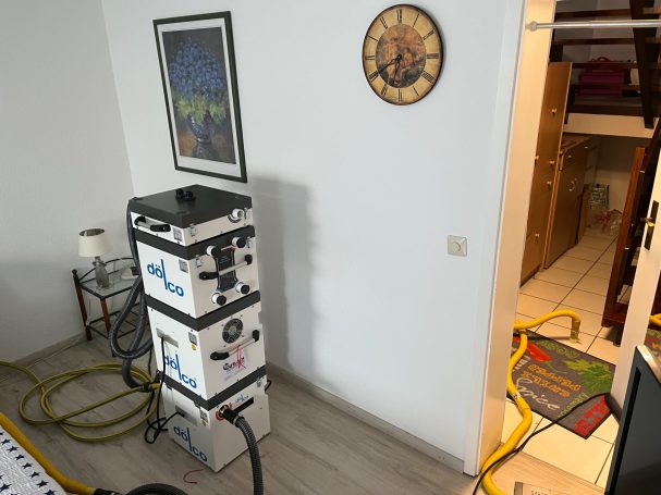 Danach installieren wir die individuell abgestimmte technische Bautrocknung. Je nach Schadensbild kommen bewährte Trocknungsverfahren zum Einsatz, um Bauteile und Materialien gezielt zu trocknen.
